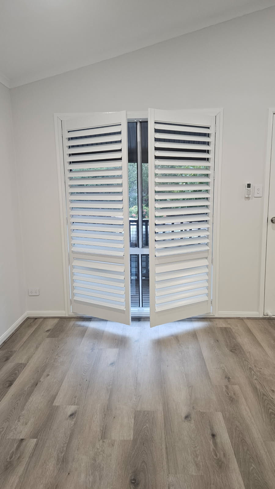 This project showcases bright, modern rooms with white plantation shutters and wooden flooring. The images capture the elegance and functionality of plantation shutters in a contemporary setting.